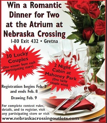 NEBRASKA CROSSING STORES ARE GIVING ONE LUCKY COUPLE A CHANCE TO WIN A ROMANTIC WEEKEND STAY IN A CABIN AT EUGENE MAHONEY STATE PARK 30 LUCKY COUPLES WILL WIN A ROMANTIC DINNER FOR TWO AT THE ATRIUM AT NEBRASKA CROSSING.ALL THIS COURTESY OF THE PARTICIPATING NEBRASKA CROSSING FACTORY STORES BUSINESSES.